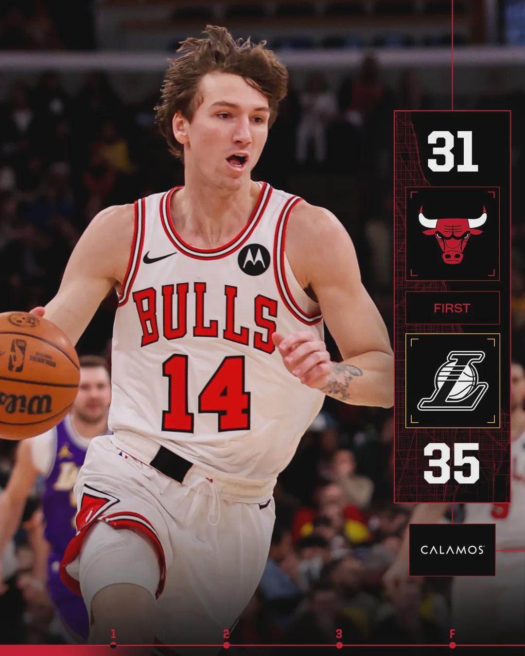 公牛核心约什-吉迪刚复出打了两场,有出场时间限制,今天继续替补出战。截至今天赛前,湖人27胜17负排名西部第5,公牛23胜22负排名东部第9。说回比赛,第一节湖人火力全开,东契奇单节14分4助攻,詹姆斯单节8分进账。
